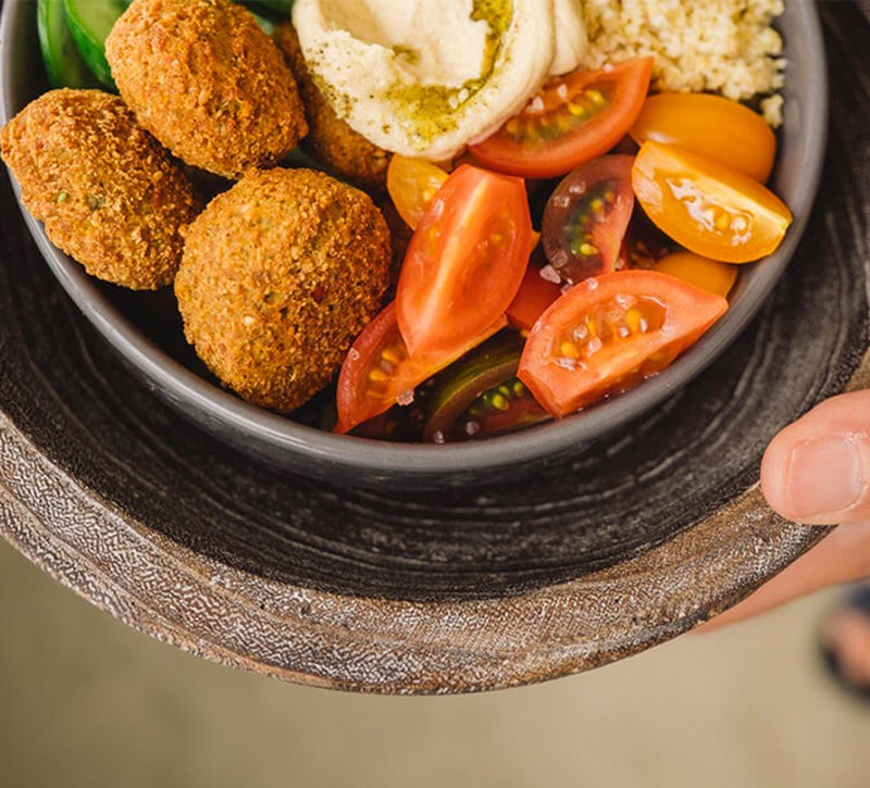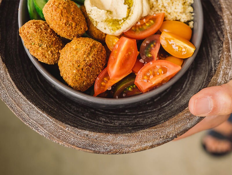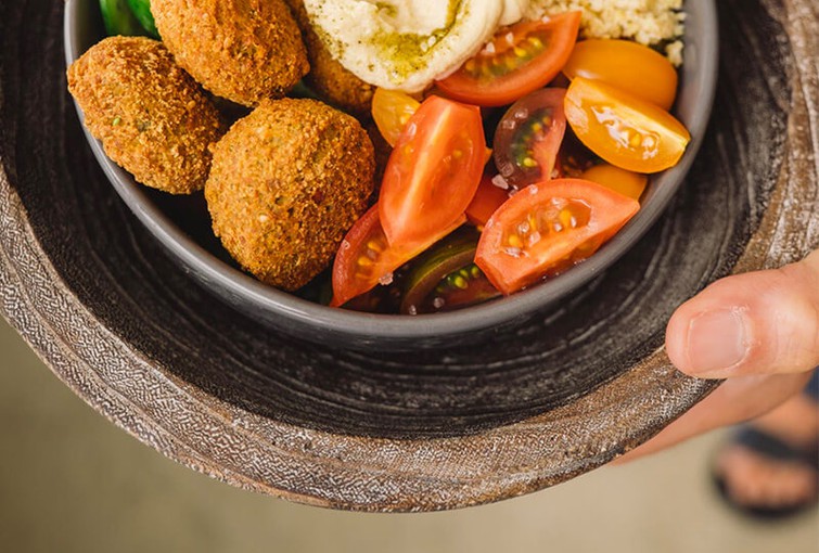 Falafel burger with tahini sauce and fresh salad.